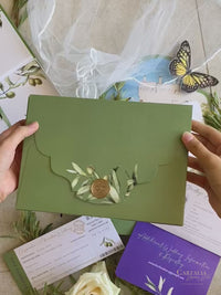 Crafted with precision and care, this magnificent invitation suite includes passport with rounded corners in custom eco leather with bespoke foiling & design - taking inspiration from the destination of the wedding both the monogram and the olive tree's of the location inspired us to bring this at the core of the design.