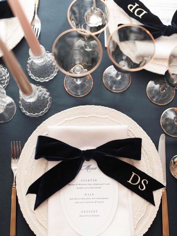 This black hardcover booklet is adorned with a debossed monogram and letterpress, featuring elegant gold foil hotstamping.