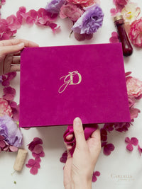 A bold and sophisticated statement piece for modern weddings, this vibrant fuchsia velvet box opens to reveal a laser-engraved acrylic invitation with gold foil details and a beautifully dyed ombré tassel. A matching insert card sits neatly in the velvet pocket — ideal for welcome events, itineraries, or additional guest information.