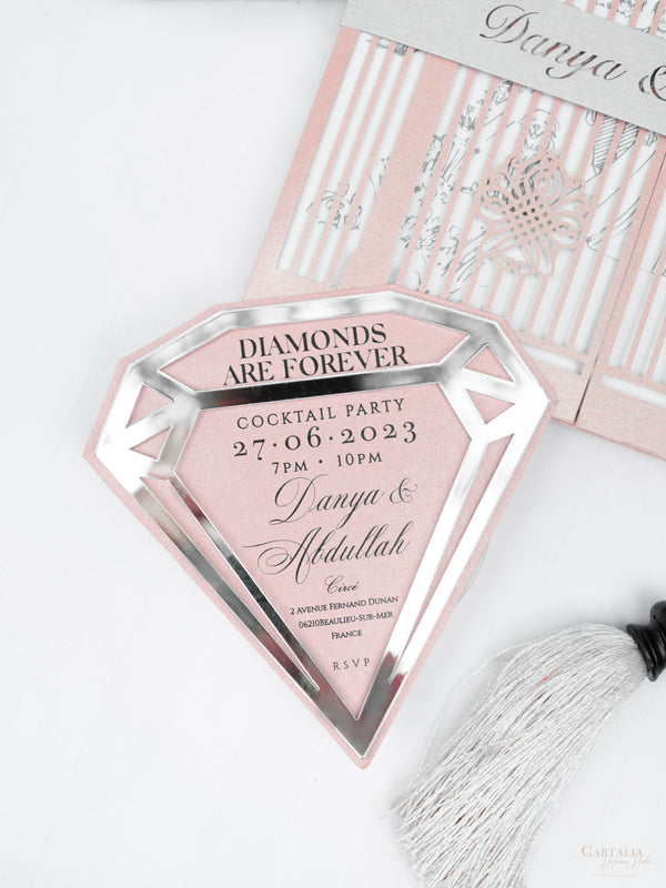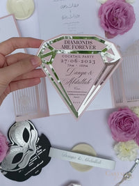 This Bespoke Commission personalised Cocktail Party invitation in silver mirror plexiglass in a diamond shape.