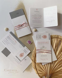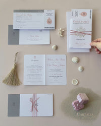 - Day Invitation Booklet (Passport) + RSVP (Boarding pass) + Vintage Pink Ribbon Tie + Envelope.