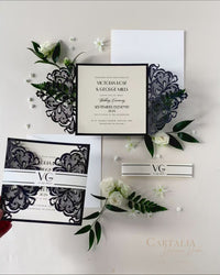 Gorgeous personalised day wedding invitation with intricate laser cutting. The cover is made from Black 300gsm Fine Black Board Laser Cut with outmost precision with Pearlised Ivory Card Monogram Band add the personalised luxurious touch to your wedding.