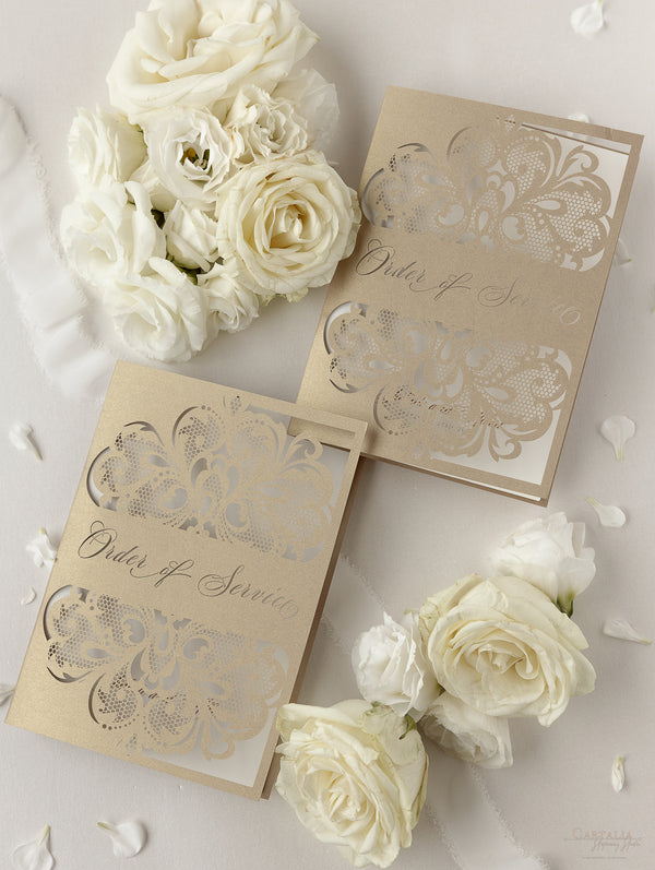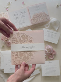 Luxury Blush Opulence Laser Cut Lace Pocketfold Wedding Invitation Suite with 3 Tier: Guest Info & Travel & RSVP Card