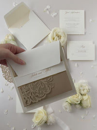 Luxury Old Gold Opulence Laser Cut Lace Pocketfold Wedding Invitation Suite with 3 Tier: Guest Info & Travel & RSVP Card