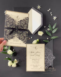 Black Opulence Elegant Laser Gatefold with Ribbon Tie design and Gold Glitter