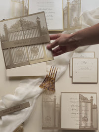 Romantic Ornamental Gate Laser Cut Wedding Invitation Set with RSVP and Personalised Belly Band