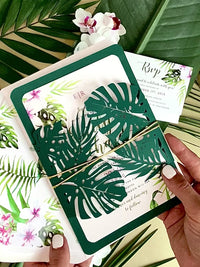 Monstera Tropical Botanic Leaf Green Laser Cut Floral Destination Wedding Invitation with RSVP Card and Lined Envelopes