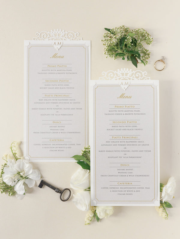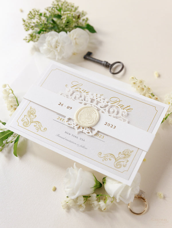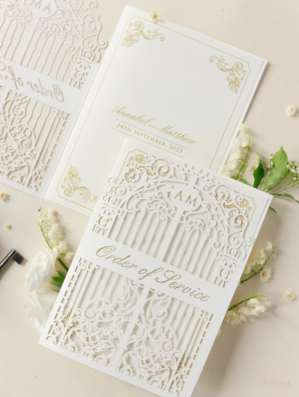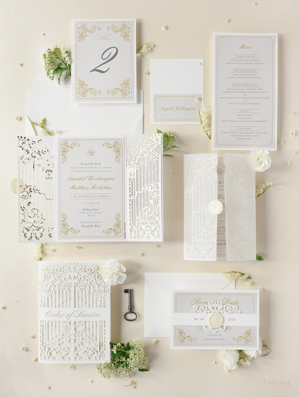 Romantic personalised Table Numbers matching Luxury Venue Inspired Ornamental Gate Laser Cut Day Invitation with Vellum with Wax Seal.