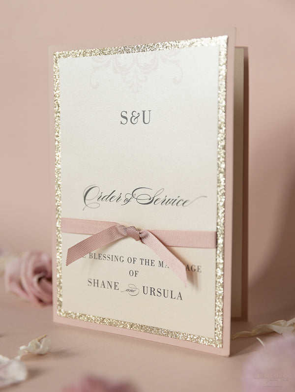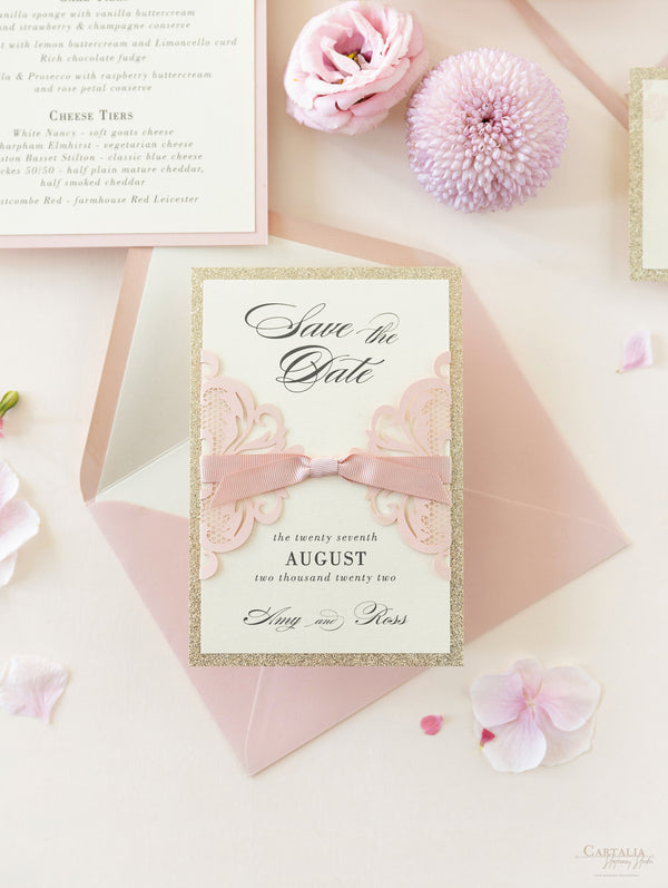 Table Number for Rose Gold Opulence Luxury Laser Cut with Gold Glitter and Ribbed Ribbon