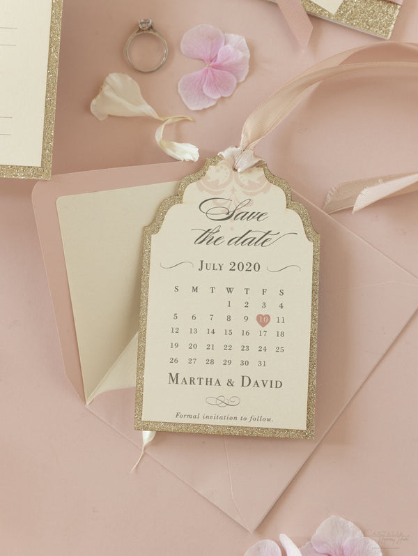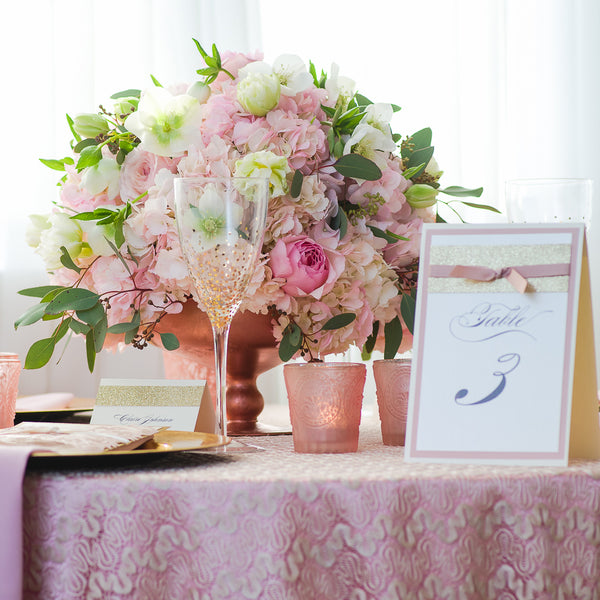 The Rose Gold Opulence Table Number is an new take on romantic pinks with adding a sparkle of glitter.