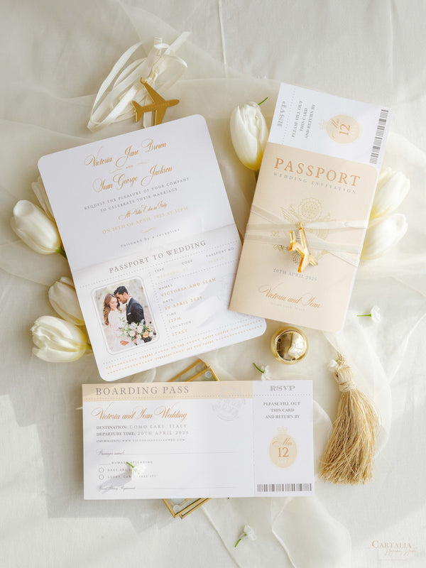 Premium Nude Leather Passport Invitations with Gold Foil & Personal Engraving