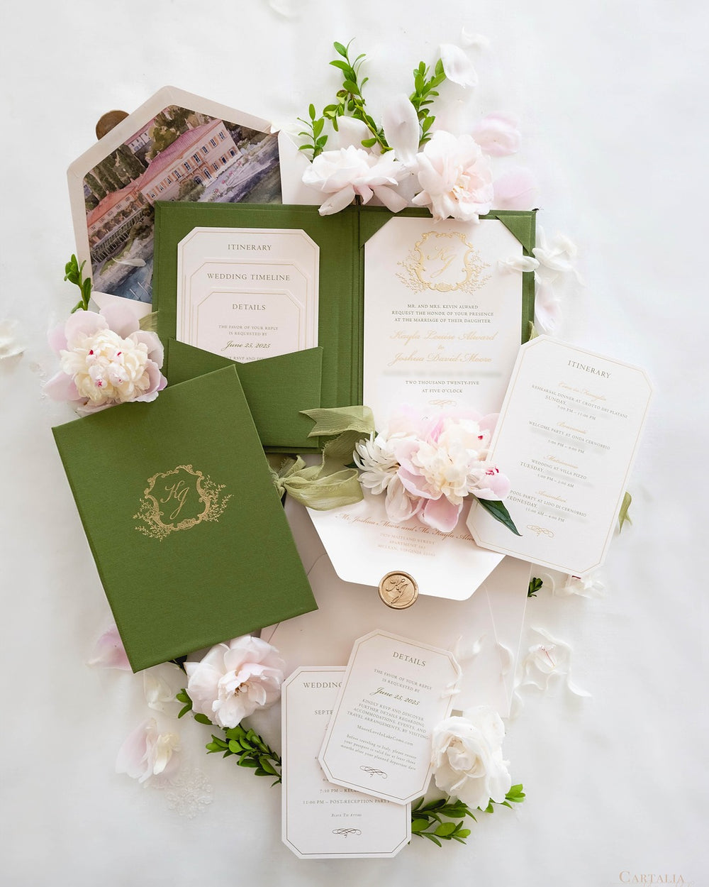 Green Luxury Linen Hard Back Folio Invitation with Gold Foil, Embossing & Letterpress Finishes | Watercolour of Villa Pizzo, Lake Como, Italy