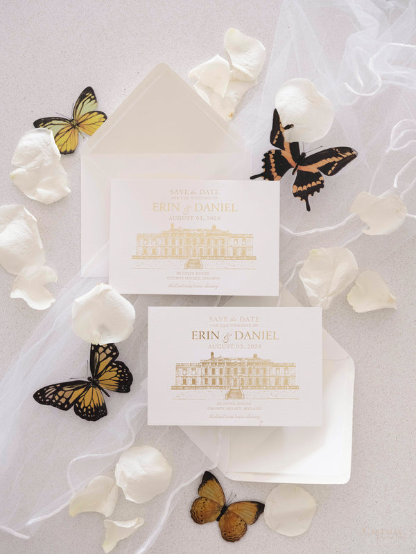 Letterpress Save The Date with Gold Foil Venue Sketch | GLOSTER HOUSE