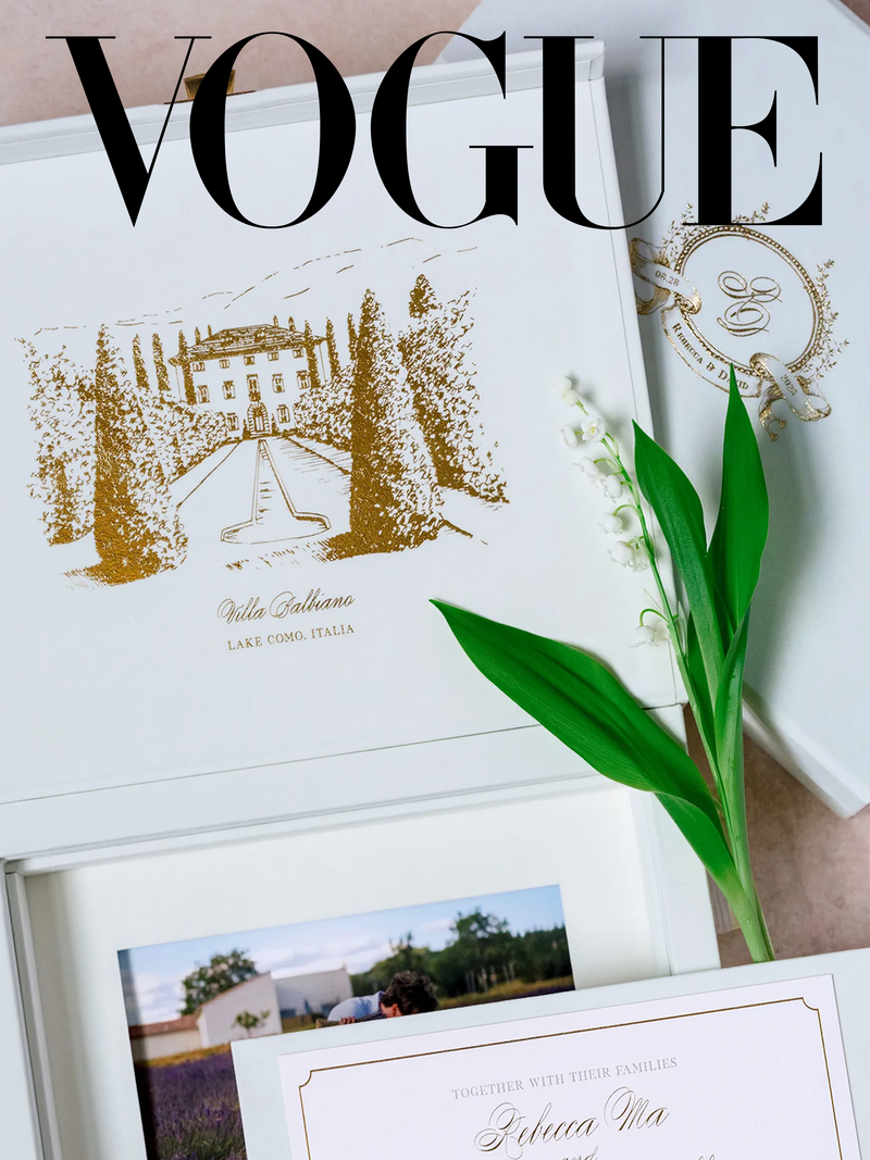 3D Luxury Velvet Hard Back Boxed & Ribbon Invitation with Gold Foil Venue | Bespoke Commission L&M , Villa Balbiano, Lake Como
