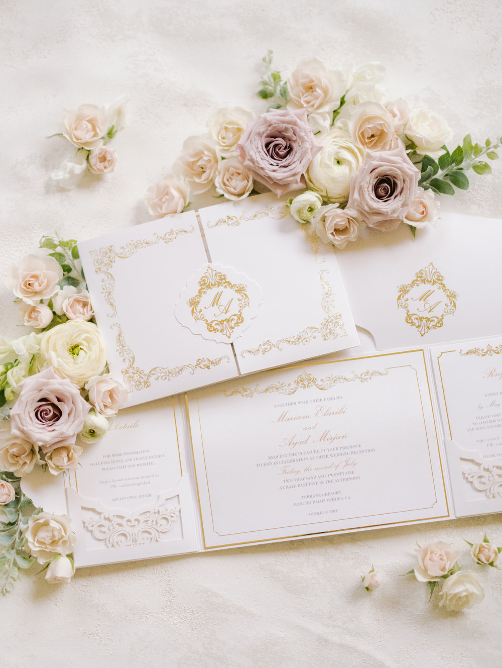 Luxury Gold Foil Invitation pocket fold suite for Wedding Day, RSVP, Info Card with Laser Cut pocket, Calligraphy Script