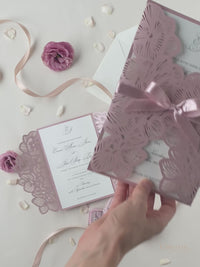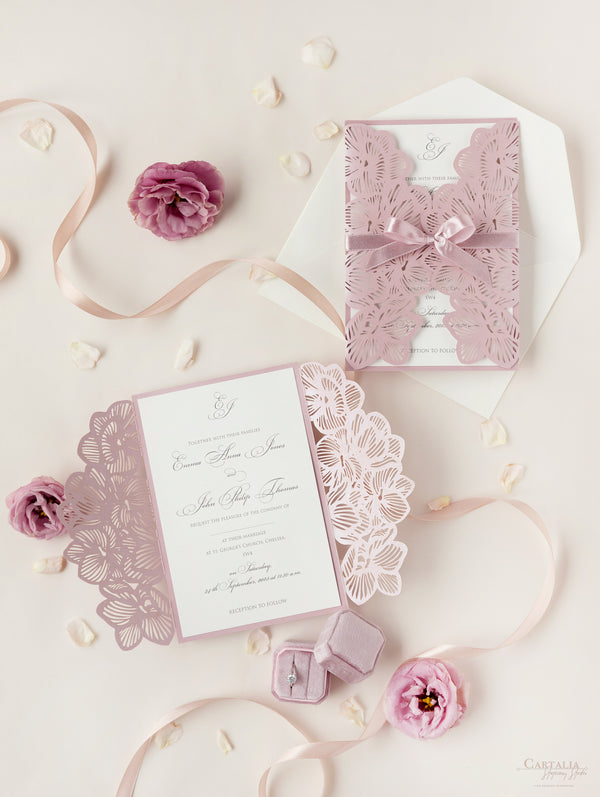Intricate Orchid with Satin Ribbon Laser Cut Gatefold Wedding Invitation