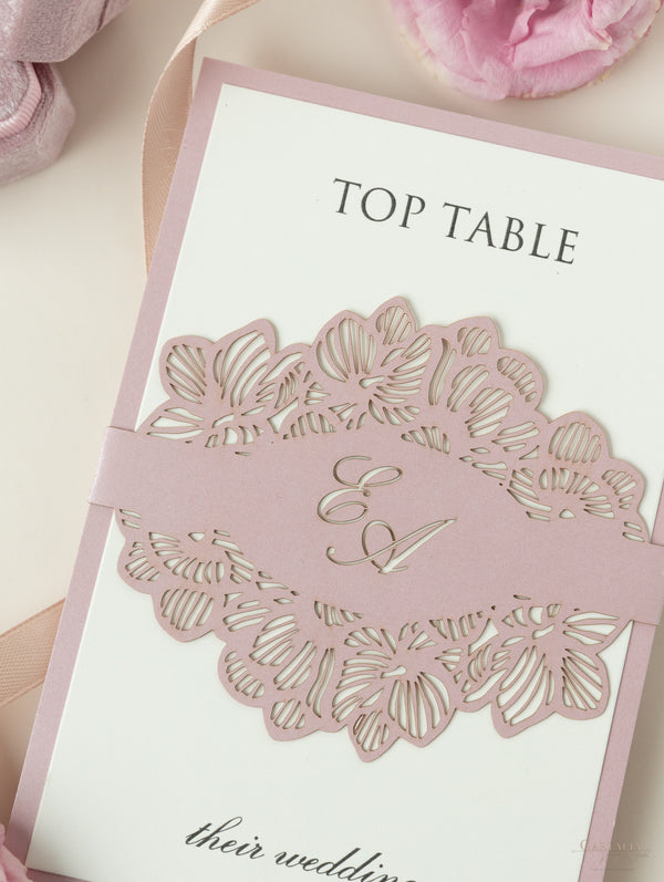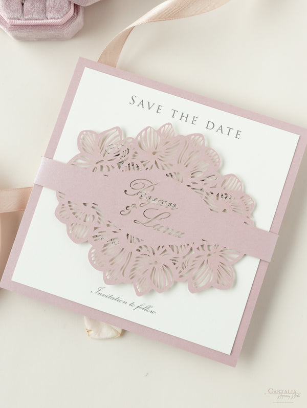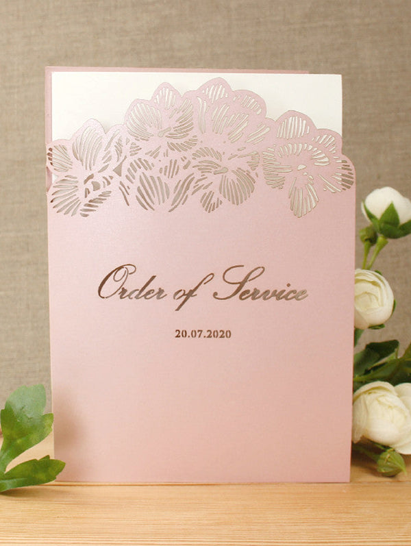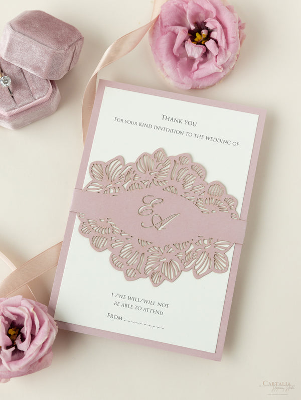 Gorgeous personalised day wedding invitation with intricate laser cut floral motifs.
