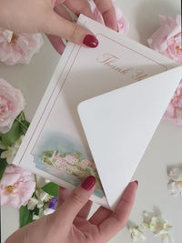 Say thank you with style with these luxurious bespoke cards featuring a stunning watercolour painting of Lake Como's Villa del Balbianello. The gold foil monogram adds a touch of elegance.