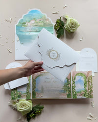 Luxurious Pocket invitation sets the tone for your Wedding Day, especially when your venue is the stunning Villa del Balbianello in Lake Como. With a bespoke commission of 3 watercolour commissions and half arches to truly compliment that iconic balcony view. This folio comes with pockets and 2 inserts on right and left of the main invitations this is truly the out most luxurious card that will invite your guests in timeless style.
