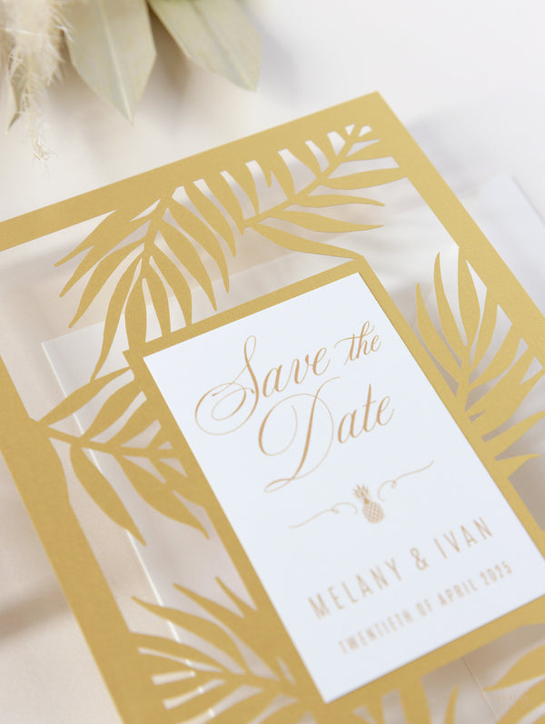 Golden Destination Beach Palm Tree SAVE the Date, Laser Cut