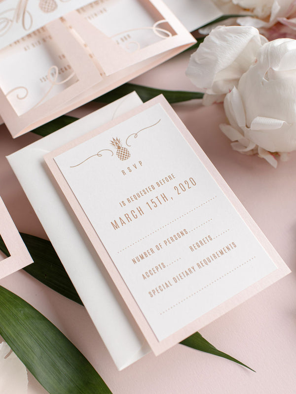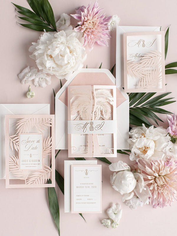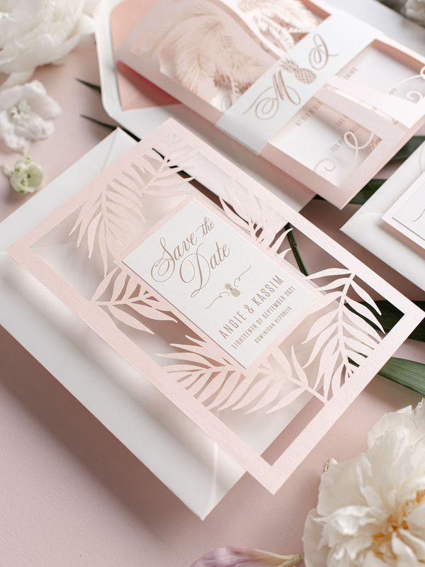 This fabulous NEW Destination Wedding Laser Cut Day invitation in form of a Palm Tree is our way to say Hello Tropics!