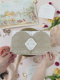 - Monograma personalizado en lámina dorada en sobre y cierre