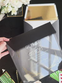 Diseño a medida con impresionantes detalles art déco cortados con láser. Con tapa de caja cortada con láser, monograma laminado e inserciones negras con detalles dorados.