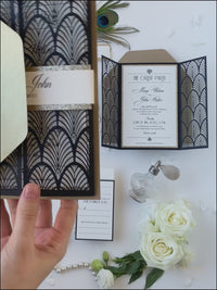 La fabulosa tarjeta Gatefold inspirada en el Art Déco de los años 20 consta de una invitación personalizada para el día con una banda para el vientre y un sobre ajustado.