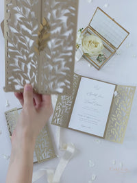 Esta preciosa invitación plegable para el día de la boda está hecha de papel dorado metálico con un inserto blanco.