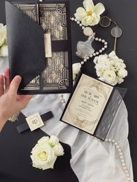 Artículos incluidos : Invitación del día + Sobres + Banda para el vientre Tarjeta negra + Etiqueta con monograma en tarjeta de champán + Sobre negro + Forro de sobre de champán