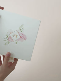 Impresionante invitación de boda en caja: con una explosión de flores color agua color rubor impresas en la funda de vitela y su propio monograma en la cubierta de la funda, esta es la invitación de boda perfecta para un día romántico, atada con una lujosa cinta de raso francés en un lazo.