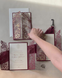 Impresionante invitación para el día de la boda con puerta ornamental de Marsala cortada con láser y lámina dorada