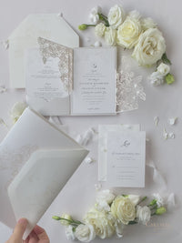 Suite con intrincadas rosas cortadas con láser en lámina perlada con tarjeta Rsvp
