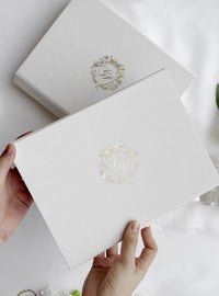 Une magnifique invitation comprenant une boîte en velours de qualité supérieure avec monogramme et croquis du lieu en feuille d'or.