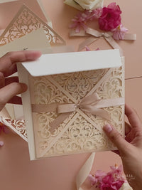 Magnifique faire-part de mariage personnalisé avec découpe laser complexe. La couverture est en carton nacré couleur pêche doux, finement découpé au laser avec une précision extrême, avec un ruban assorti pour une touche luxueuse et personnalisée à votre mariage.