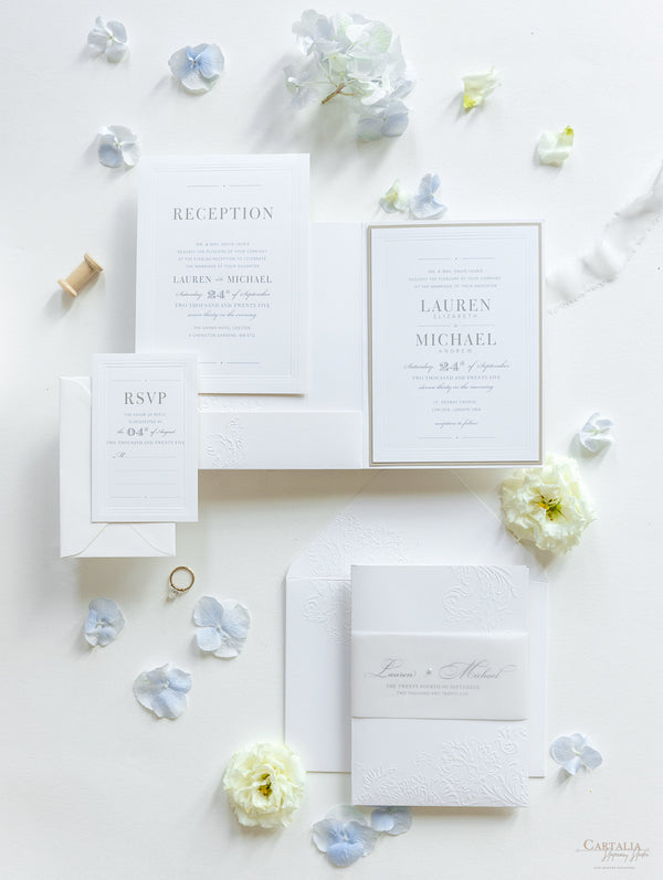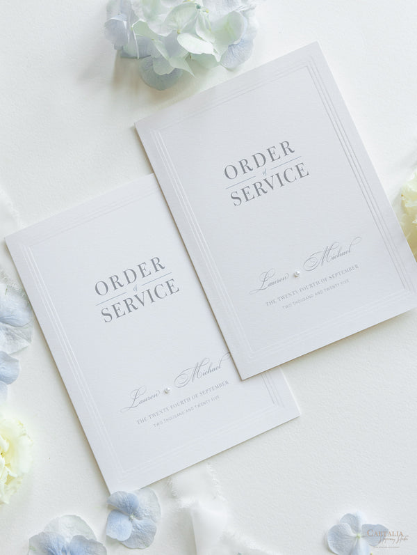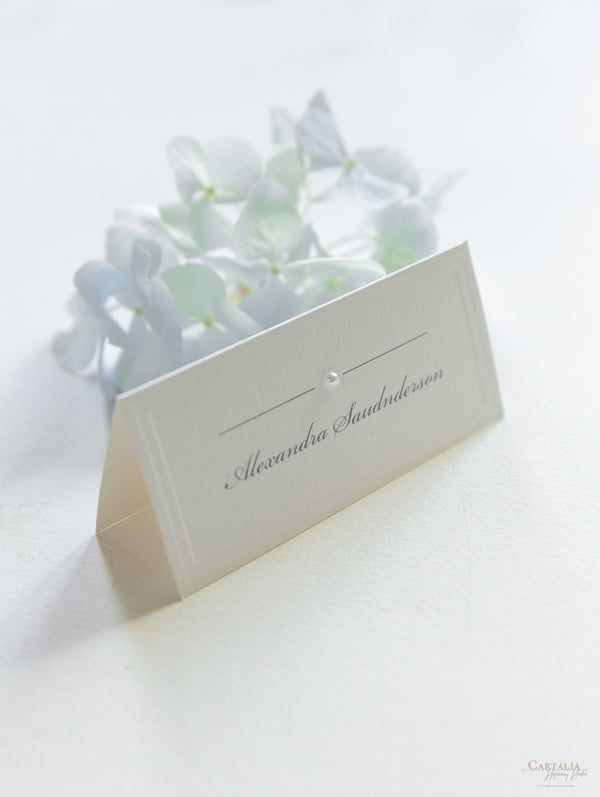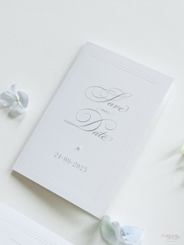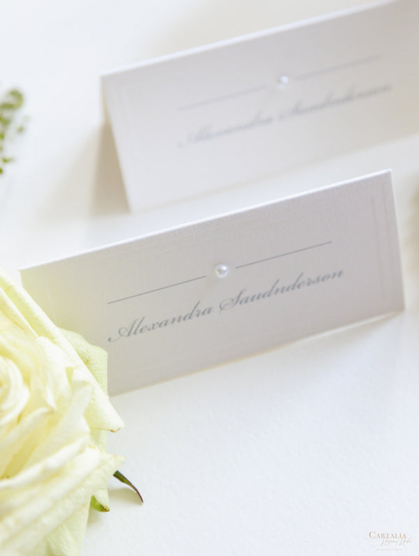 Vera eleganza con una nota di modernismo. Menù nuziale di lusso in rilievo con dettaglio di perle.