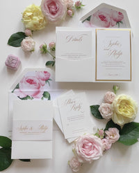 Vera eleganza con una nota di modernismo. Wedding Luxury Romantic pocket suite con dettagli floreali e lamina d'oro, cartoncino di lusso avorio perlato e fascia ventrale in pergamena. Personalizza questo set nuziale unico durante il processo di ordinazione con i colori, la scritta e il biglietto di ricevimento del tuo matrimonio.