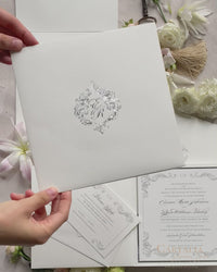 Cartella quadrata regale in lamina con busta con bordo increspato Tasca avorio con suite nuziale con monogramma in lamina