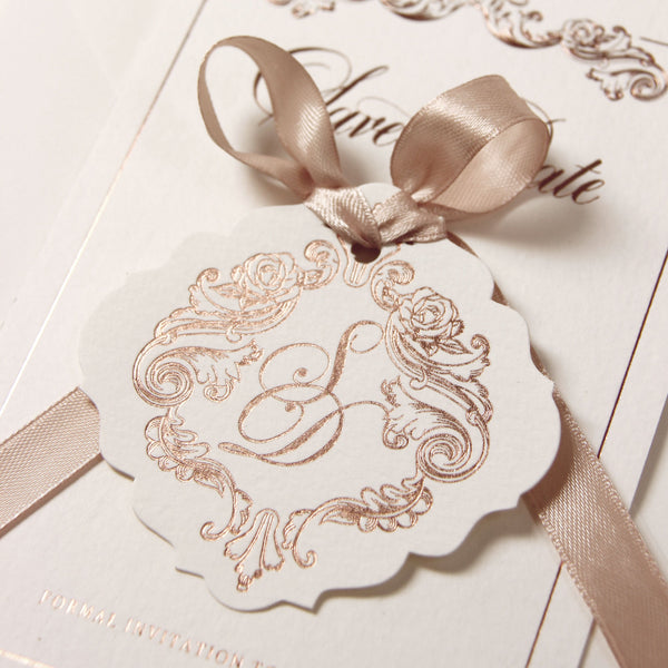 • Personalizzazione con monogramma dei nomi degli sposi in lamina.