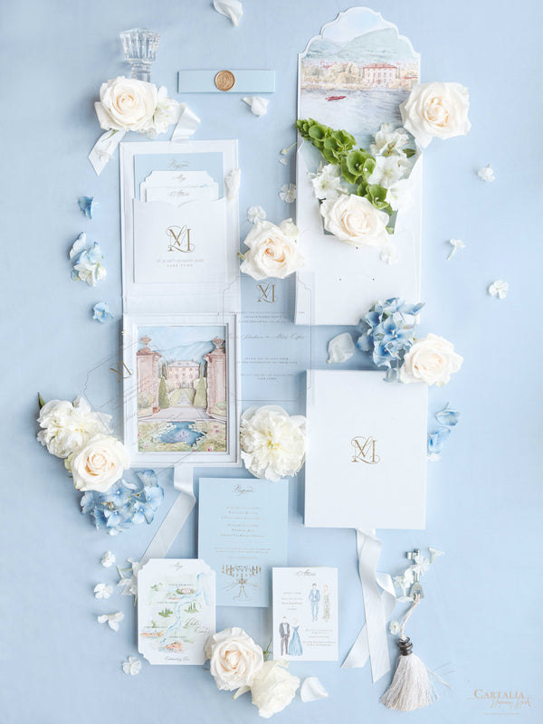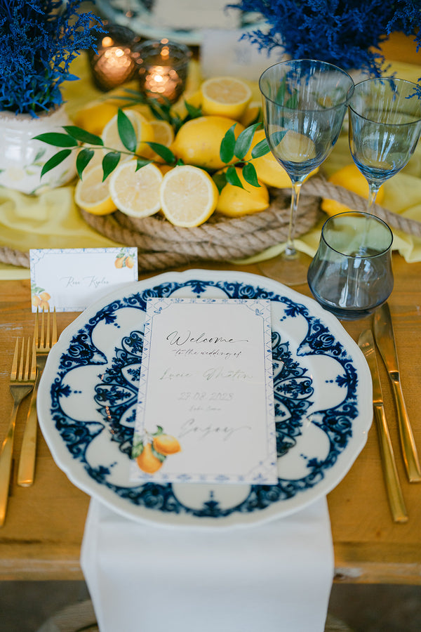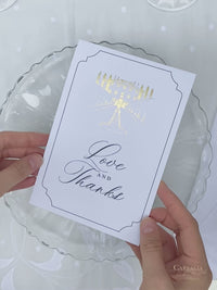 Esprimi la tua gratitudine con i nostri squisiti biglietti di ringraziamento, caratterizzati da uno splendido design in lamina d'oro sul davanti, che mette in mostra l'eleganza del luogo del tuo matrimonio. Il retro è ornato da un sigillo in ceralacca, che aggiunge un tocco di raffinatezza.
