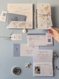 Dusty Blue & Gold Wedding Passport Invite FOLDER : Luxury Wallet & Tag Passport Invitation